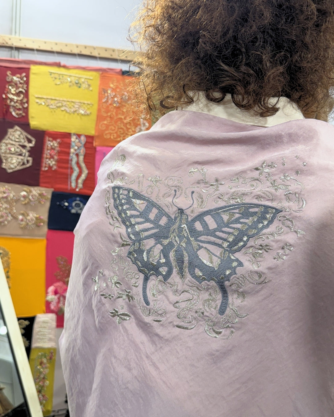 Elegance & exuberance create a breathtaking harmony in a soft pink scarf. Crafted in a fluid, fuss-free weave, the scarf features a statement butterfly motif crafted with meticulous Resham dhaaga embroidery and kasab handwork.